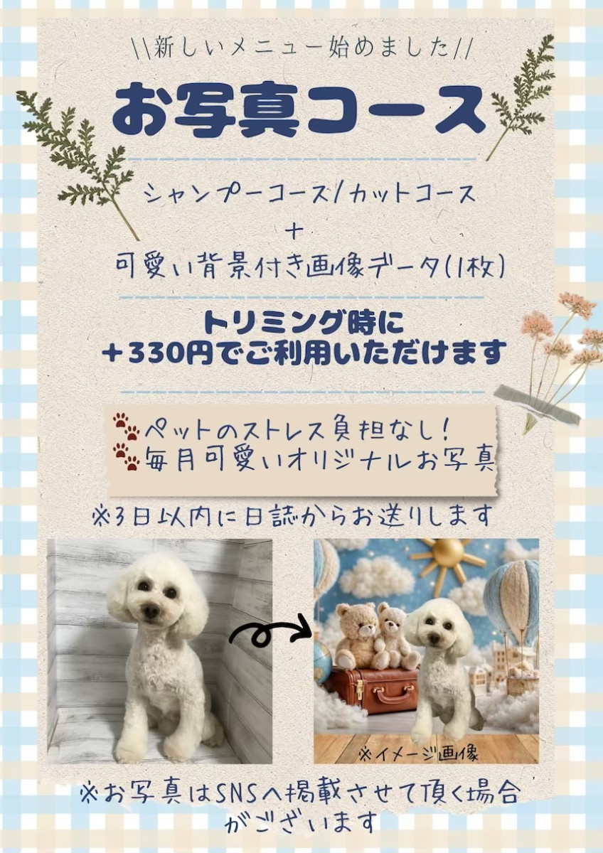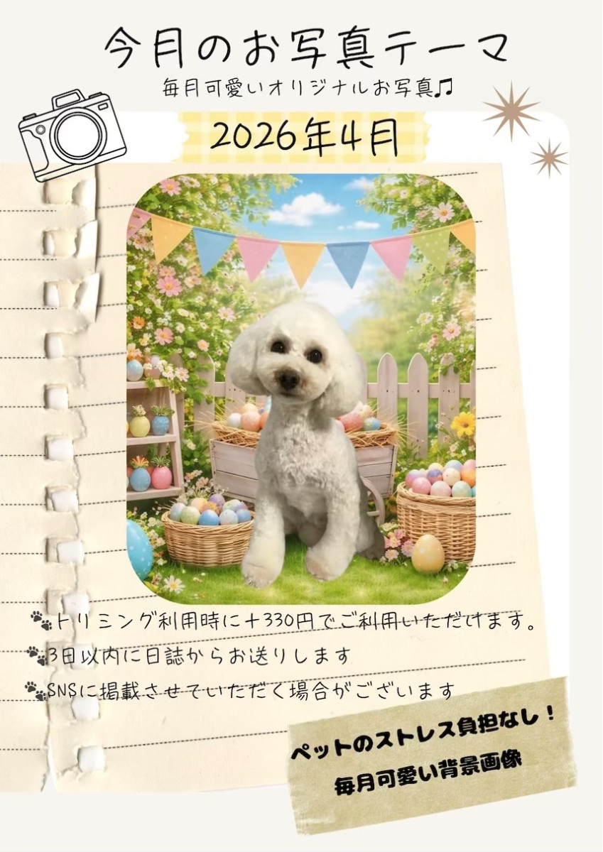 2026年4月からシャンプーコース/カットコースご利用時に+330円で可愛い背景画像データを日誌からお送りするサービスを開始致します。